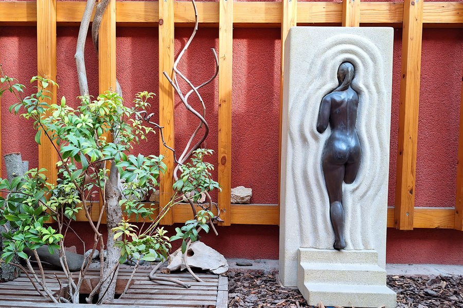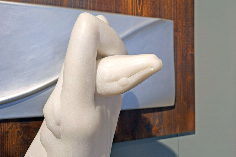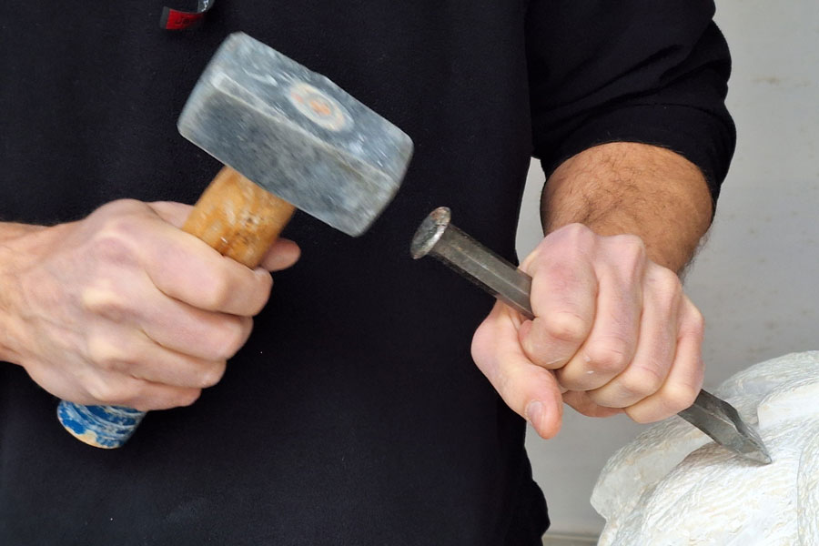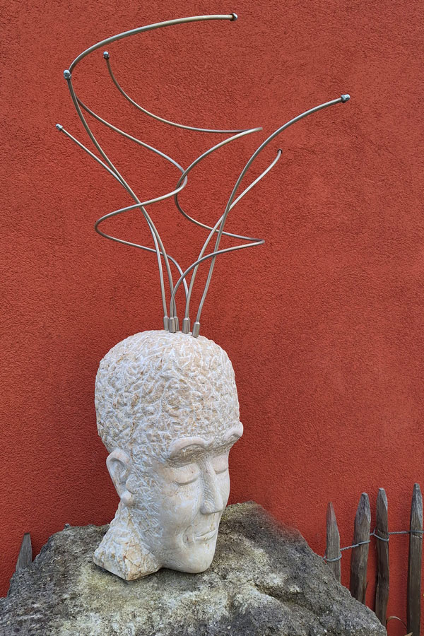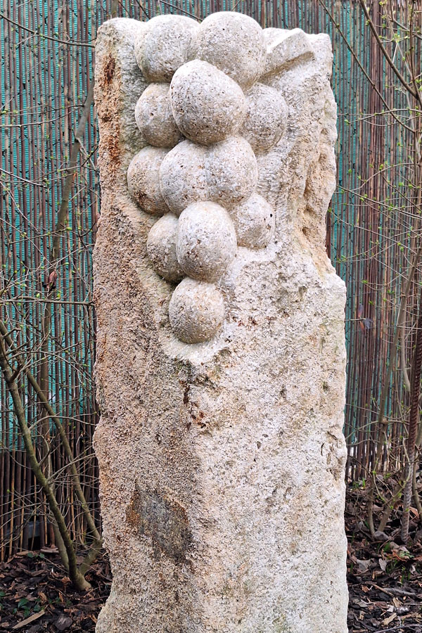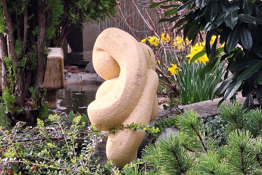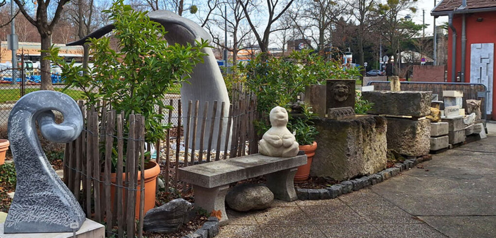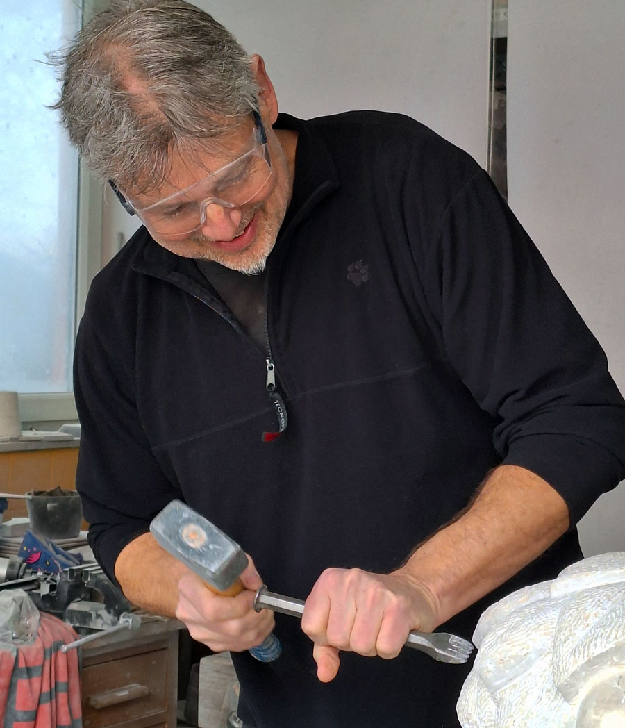 Skupltur aus Sölker Marmor Die Objekte sind durchwegs mit Titeln versehen und manche durch eine Beifügung wie „Skulptur des Jahres“ geadelt. Noch ist es die „Befreiung“, die aber vom „Brainstorm“, einem Kopf mit verwirrten Metalldrähten als Frisur, abgelöst werden soll. Mit Wappen, Denkmälern auf Friedhöfen oder der Trophäe für die Bruno-Gala des Fußballs aus Bronze ist Reinhard Winter immer wieder in der Öffentlichkeit vertreten. Seinen eigenen Garten hat er mit einem Wahrzeichen für den Bezirk ausgestattet. Es ist der Als-Wal, der spektakulär abtaucht und nur mehr an seiner lebensgroßen Schwanzflosse zu erkennen ist. Jede einzelne der nahezu unzähligen Plastiken erzählt so ihre ganz besondere Geschichte; auch das Kalksteinbäumchen, das Früchte trägt und eine davon sogar fallen gelassen hat, mit Bronzeschale und Steinkern, aus dem, wie Reinhard Winter fein lächelnd versichert, ein neues Bäumchen wächst. Das Atelier in 1170 Wien, Schultheßgasse 8 wird vor den kommenden Feiertagen zur Ostergalerie im Bildhauerzentrum. Reinhard Winter verspricht große und kleine Geschenke zum fröhlichen Verstecken, wenn „arteum & friends“ an vier Tagen (Sa., 23., So., 24., Mi., 27. und Sa. 30. März 2024) ihre Kunst zum Kauf anbieten. Es ist die einmalige Gelegenheit, mit dem Meister in ein angeregtes Gespräch zu kommen, auf entspannte Weise in die Geheimnisse seiner Berufe hineinzuschnuppern oder einfach die inspirierende Atmosphäre des arteum zu erleben und eventuell zu versuchen, im Sinne der „Verschmelzung“ sogar in den Stein körperlich einzutauchen.