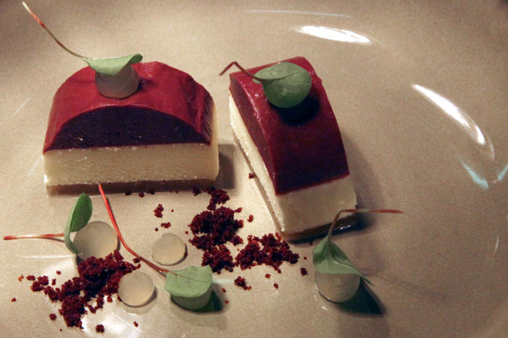 Manche der Gerichte lassen den Gast erstaunt aufblicken. So findet sich im MENÜ VIER-GANG (mit perfekter Weinbegleitung unter der kundigen Winzertochter Anna Andert) als erster Programmpunkt eine Blunze, aber alles andere als eine gewöhnliche Blutwurst. Sie wird raffiniert als Terrine angerichtet, in Kombination mit einem Sauerkrautgelee, Kren und Ampfer. Um eine ebenso spannende Kreation handelt es sich beim konfierten Saibling.