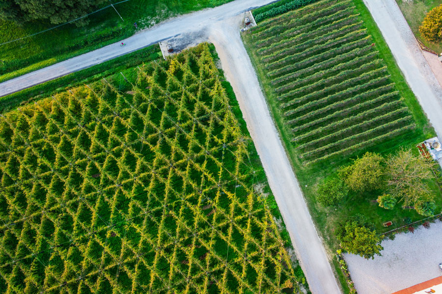 Manche der Weingärten in San Polo di Piave, einer Gemeinde von Venetien nahe Treviso, erinnern, aus der Vogelperspektive betrachtet, an Bienenwaben oder an eine gigantische Stickerei. Mit einem Karomuster überspannen die Stöcke in drei, vier Meter Höhe die Weinberge. Gehalten werden sie von Holzpfählen, deren Spitzen mit Drähten verbunden sind und jeweils vier Reben zu halten haben. Steht ein Maulbeerbaum dazwischen, wird auch er als Stütze verwendet. Von unten betrachtet ist es ein beeindruckendes Dach aus Ranken und Blättern, das einerseits angenehmen Schatten bringt, andererseits aber auch den Anbau von Gemüse auf dem Boden ermöglicht.