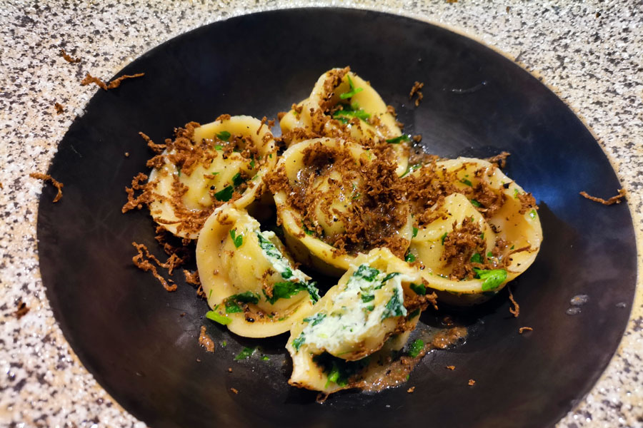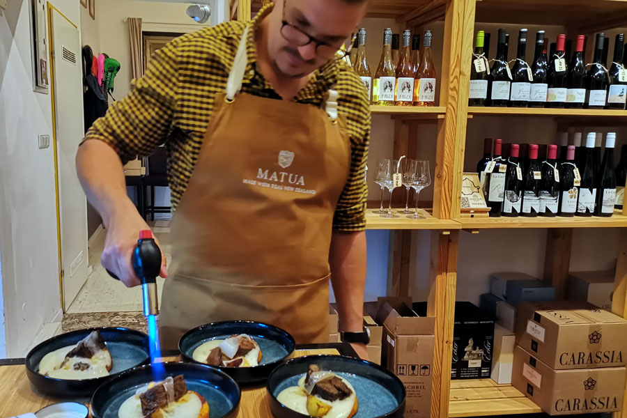 Ein Beispiel für eine solche Region ist Somló, keine zwei Autostunden von Wien entfernt. Aus der weiten Ebene der Puszta erheben sich schwarze Basaltfelsen, von denen Weingärten überragt werden. Das junge Weingut Kreinbacher erzeugt dort neben den in Ungarn üblichen Sorten wie Juhfark (Lämmerschwanz), Traminer oder Furmint auch Sekt. Zoltán entkorkt behutsam ein Flasche Brut Extra und eröffnet mit diesem fruchtigen Schaumwein einen genüsslichen Reigen. An bestimmten Tagen wird Abendessen mit Weinbegleitung angeboten. Wer sich dafür rechtzeitig angemeldet hat, wird von Adam bekocht und zu jedem Gang mit dem idealen Wein versorgt. Speck und getrockneter Schinken vom Mangalitzaschwein bilden das Entree. Im zweiten Gang vermählt sich ein in Säure und Zucker harmonischer Rizling aus Badascsony mit gebratenem Oktopus. Über die nun folgenden Ravioli – der Teig wird im Lokal auf einer Nudelmaschine in Form gebracht – hobelt Adam großzügig ungarische Trüffel und serviert dazu einen ungewöhnlich gehaltvollen Olaszrizling. Den Höhepunkt, ein über Stunden sous vide gegartes Hirschfilet, begleitet ein trinkfreundlich tanninarmer und bewusst kühl gehaltener Kékfrankos aus der Soproner Gegend. Den krönenden Abschluss bildet ein sechs Puttony von Gróf Degenfeld. Nicht umsonst galt der Tokajer lange als Wein der Könige und König der Weine. Mit einer Kombination aus Apfelgelee, Pekanüssen und darüber geriebener getrüffelter Gänseleber gehen die fruchtige Süße und die von einer lebendigen Säure herrührende Frische des Weins tatsächlich eine noble Verbindung ein.