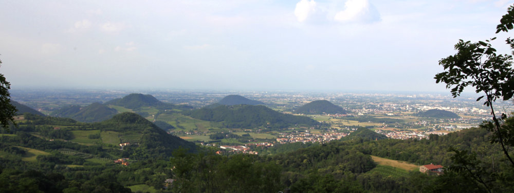 Die Vulkankegel prägen nach wie vor das Aussehen der Colli Euganei. Sie sind schon von Venedig aus zu sehen und umgekehrt könnte man von den Hügeln an sehr klaren Tagen die Lagunenstadt am Horizont im Osten ausnehmen. Um den Blick von hoch oben über die Weiten der Ebene gleiten zu lassen, bieten sich einige ideale Aussichtspunkte. Einer davon ist die Passhöhe von Il Roccolo mit einer gemütlichen Trattoria samt Aussichtsterrasse und ein zweiter der Monte della Madonna, benannt nach einem kleinen Wallfahrtswort mit einem ungemein stimmungsvollen Kirchlein mit einer aus Avesa Stein gemeißelten Marienstatue aus 1350.