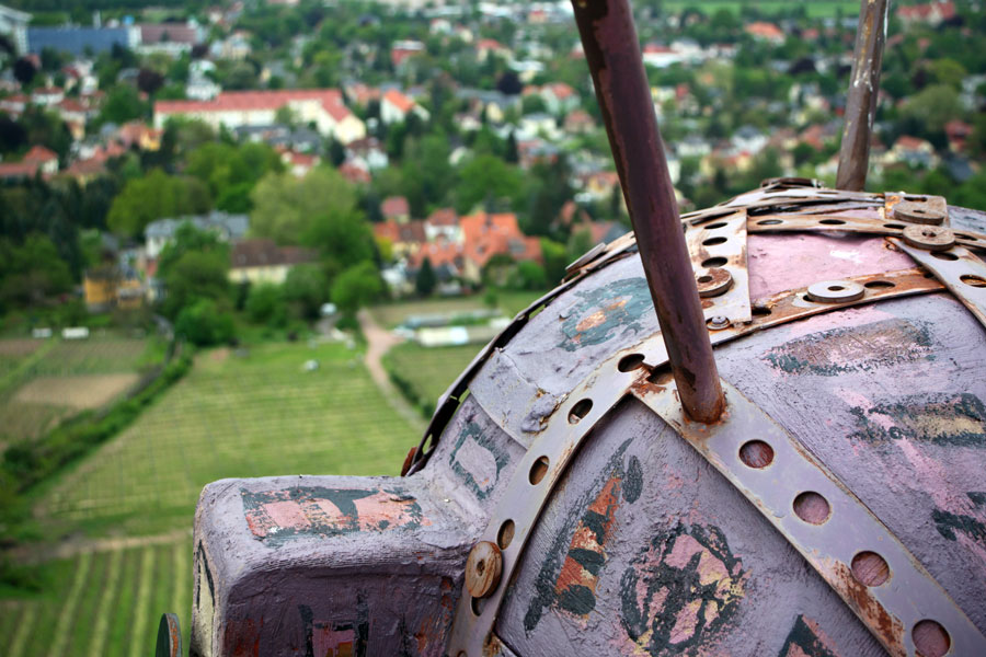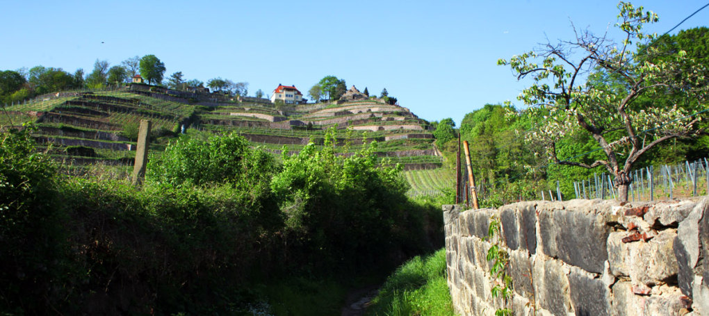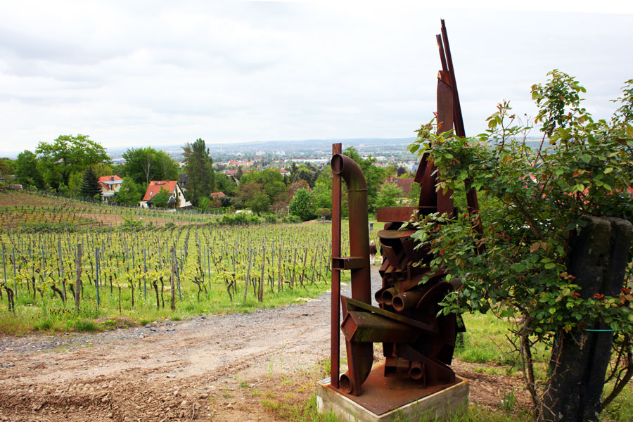 Er erweiterte das Weingut zu einer Galerie, zu einem Schauplatz für seine Kunstsammlung. Die Terrassen, wegen ihrer Herkunft „Württembergische Mauern“ genannt, wurden mit Skulpturen bestückt, die man im Zuge einer Wanderung hoch zur „Steinernen Schnecke“ immer wieder bei Rosen- und zwischen Weinstöcken entdeckt. „Diese Schnecke“, so lässt Prof. Beck seine Besucher gerne an seinem großen Wissen teilhaben, „ist der nunmehr letzte derartige Bau aus dem 16. Jahrhundert in Deutschland.“ Bekrönt wird sie seit 2016 vom „Schneck“. Über diesen Keramikkopf von Detlef Reinemer blickt man über Dresden hinweg weit über das sächsische Sandsteingebirge bis ins Böhmische nach Süden.