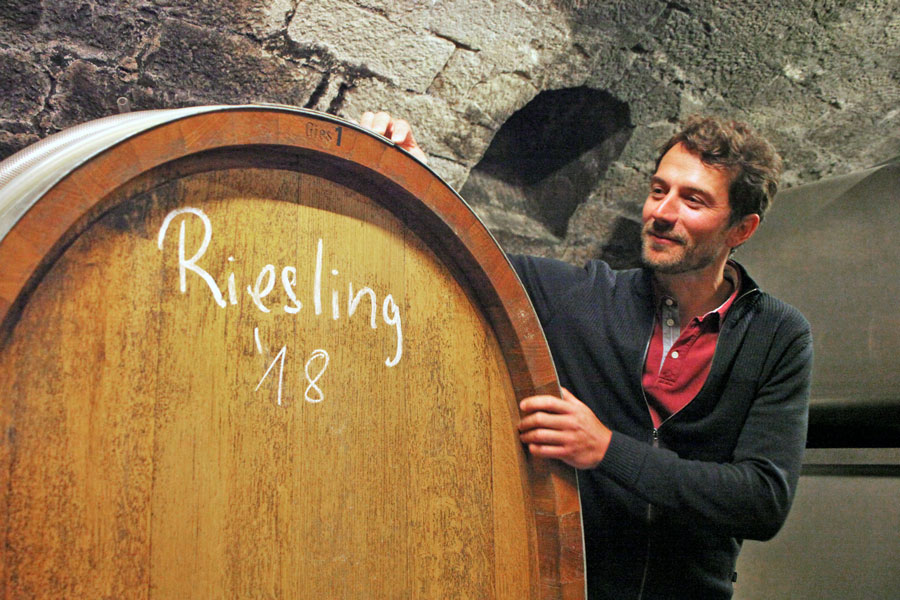 Weit vorne steht der Goldriesling, im Grund kein Riesling, sondern, wie es der Kellermeister mit einem Augenzwinkern ausrückt, „ein Frühstückswein mit wenig Alkohol und einem extrem frühen Lesezeitpunkt. Nach einer Maischestandzeit von sechs Stunden wird daraus aber eine unverwechselbare Spezialität mit schöner Aromatik aus reifen gelben Früchten. Da wir mittlerweile nur in Sachsen diesen Wein erzeugen, dürfen wir ruhigen Gewissens von einer autochthonen Sorte sprechen.“