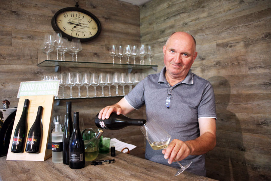 Es ist freilich ein Scherz, den der Winzer zu seinem Namen auf Lager hat: „Wer nicht Bauer heißt, muss ein Zugezogener sein.“ Aber in Feuersbrunn und Umgebung gibt es tatsächlich eine ganze Reihe von Winzern mit dem Familiennamen Bauer. Sein Weingut heißt deswegen ausdrücklich „Josef Bauer“. Es kann auf das Gründungsjahr 1896 zurückblicken und ist mit seinen Weißweinen bekannt geworden. Bis in die späten 1980er-Jahre gehörte auch das benachbarte „Gasthaus zum goldenen Kreuz“ dazu. Es wird seither von Bruder Gerhard betrieben. Josef, der in jungen Jahren als Joe am Zeugl einer Big Band den richtigen Drive gegeben hat, hat sich dem Weinmachen verschrieben. Seine Liebe zur Musik beschränkt sich auf die Mitwirkung in der örtlichen Blaskapelle. Die Musen, und dazu zählt auch die Kunst in vielerlei Formen, sind dennoch wichtige Begleiter seines Lebens geblieben. Besucher der Kunsthalle Wien kennen ihn längst, wenn bei Eröffnungen Josef Bauer seit vielen Jahren mit Grünem Veltliner und Riesling zur Stelle ist, um mit großzügigem Ausschank Gespräche zu den gezeigten Werken und über die vertretenen Künstler anzuregen. Aber nicht nur die Versorgung der Kunstfreunde, auch die Kunst selbst und die Literatur sind ihm ein Anliegen. Er kann, wie er sagt, ausnehmend gut mit Alternativ-Denkern. Sein Motto hat er sich von der Secession mit in den Wagram genommen: „Der Zeit ihre Kunst, der Kunst ihre Freiheit“. Die 13 Hektar Weingärten liegen zum größten Teil am Hengstberg im Norden der Gemeinde Feuersbrunn. Der Boden lässt sich mit 80% Löss und einem Rest aus Tertiärschotter oder einem Gemenge aus beidem beschreiben. Darauf wachsen in den Lagen Spiegel, Rosenberg oder Losling 85% weiße Trauben. Der Rest ist rot und davon ist wieder die Hälfte für Joe´s Rosé reserviert. Zwei Drittel von den Weißen sind Grüner Veltliner, 20% Riesling. Seit 2015 gedeiht dort auch der Rote Veltliner, eine Sorte, ohne die ein Weingut auf dem Wagram heutzutage nicht mehr auskommt. 2017 gab es die erste Jungfernlese. Josef Bauer weiß um die Probleme, die der „Rote“ einem Winzer bereitet: „Er ist sehr spezifisch, weil extrem autochthon, damit meine ich, dass es kaum noch Selektionen gibt.“ Die Trauben sind höchst unterschiedlich. Die einen sind rundum hell rot, die anderen bräunlich, einige sind wieder vorne rot und hinten weiß, „und die Sorte ist ein richtiges Mimoserl. Beim Stecken hängen die Triebe sofort wieder heraußen. Außerdem sind die großen, dichtbeerigen Trauben extrem anfällig für Fäulnis. Spaß macht er erst im Keller“, lacht Josef Bauer, der den Roten Veltliner klassisch als leicht trinkbaren Wein, aber auch im Premiumbereich ausbaut. Sohn Florian hat mittlerweile das Kommando als Kellermeister übernommen. Eines seiner ersten großen Werke sind „Edelsteine“, entweder aus Weißem Burgunder als „Weißer Saphir“ oder aus dem Roten Veltliner als „Roter Saphir“, hergestellt in Spontangärung und Ausbau in Holz oder Keramik, also im Clayver, einem Tongefäß mit winzigen Poren, um dem Wein die richtige Portion Sauerstoff zu ermöglichen. Noch werden diese Spezialitäten im alten Keller produziert, neben der Rotweincuvée „Viktoria“ (benannt nach einer Tochter) und dem Orange-Versuch mit Sauvignon Blanc namens Leandertaler (Lea ist die Schwiegertochter in spe). Das Kellerhaus, das um 1800 herum entstanden ist, hat übrigens eine interessante Geschichte. Josef Bauer erzählt: „Als Joseph II. mit seinem Buschenschank – Patent 1774 den freien Verkauf von selbst gekeltertem Wein erlaubt hat, durften die Weinbauern die Trauben auch selbst verarbeiten. Bis dahin mussten sie das Lesegut an die Zehenthöfe abliefern.“ Damals sind die pittoresken Kellergassen entstanden, mit ihren Röhren im Löss, von denen die des Weingutes Josef Bauer immerhin 50 Meter misst. Wenn es auch romantisch aussieht, es macht allerdings viel Mühe, die eine neu geplante Anlage ersparen soll. Draußen im Weingarten darf sich die Seele erholen. Die Aussicht ist grandios. Von bestimmten Punkten aus reicht der Blick zu den fünf Weinregionen Wagram, Traisental, Kamptal, Kremstal, Wachau, „und Richtung Süden sogar bis zum Schneeberg“, klärt der Winzer seine Begleiter auf, um lächelnd hinzuzufügen, „dazwischen stehen drei Symbole für Glaubensbekenntnisse. Links steht der Kirchturm von Feuersbrunn, rechts die buddhistische Friedens-Stupa bei Grafenwörth und in der Mitte, nicht zu übersehen, der Raiffeisen-Turm.“ Vom Ort her verirren sich an diesem sonnigen Feiertag in die Ried herauf einzelne Töne der Blasmusik. Josef sollte selbst dabei sein, wird aber würdig vertreten: Am Schlagzeug von Sohn Florian, an der Flöte wirkt Viktoria und an der Klarinette die andere Tochter Katharina. Gattin Christine macht als Sängerin im Kirchenchor das familiäre Quintett komplett. Musik und Wein sind im Weingut Josef Bauer also zu einer sympathischen Einheit verschmolzen, die bei etwas Aufmerksamkeit in jedem Achterl, das freundlich den Besuchern kredenzt wird, zu schmecken ist. Statistik |