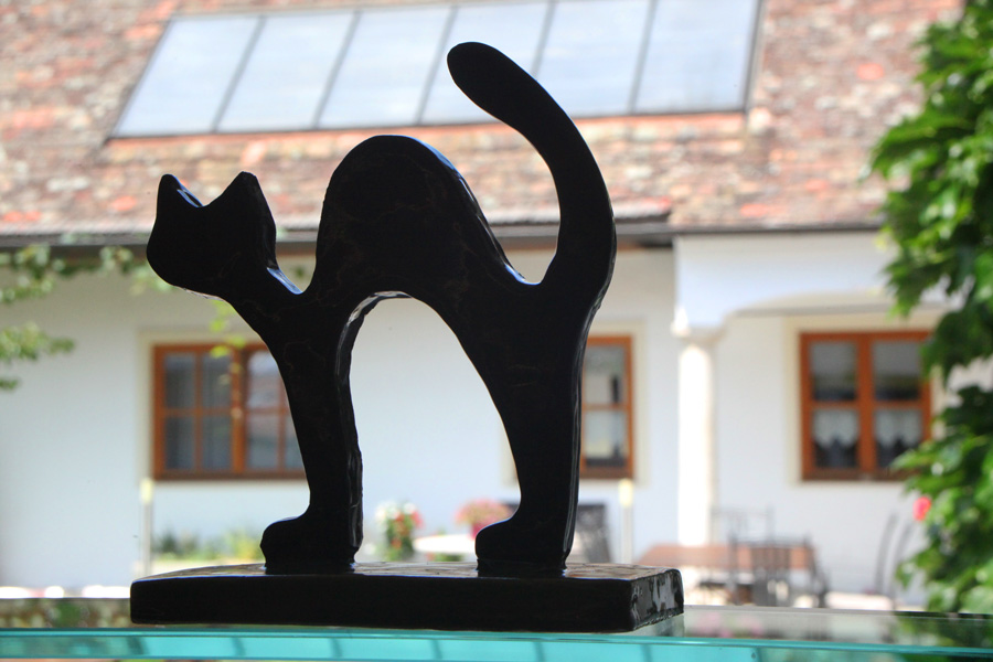 Omnipräsent ist die Kellerkatze. Es sind durchwegs Werke des Weinviertler Künstlers Günter Stockinger, die im stimmungsvollen Kostraum, dem ehemaligen Schweinestall, ihren schwarzen Buckel hochbiegen und im blitzsauberen Innenhof eventuell verirrte Mäuse verjagen. Früher saßen sie auf dem besten, weil wärmsten Fass des Weinbauern und, so berichtet der Künstler, schreckten sogar Napoleons Soldaten vom Plündern des Weins ab. Die alten Fässer gibt es bei Jungmayr noch.