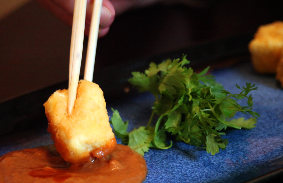 Wesentlich ist aber das Runde. „Deswegen sitzen wir auch um einen kreisförmigen Tisch herum“, erklärt Hao einen für uns eher ungewöhnlichen Brauch, „wenn wir uns wiedersehen, dann haben wir uns im Kreis gedreht. Als Symbol gibt es zu Neujahr dann süße Klebreisbällchen mit Nuss- oder Sesamfüllung, die vor allem die Kinder gerne mögen.“ Ein großes Thema sind auch die kleinen Spieße, die ebenfalls aus mageren Zeiten stammen, im Junn aber mit Hühnchen, Lamm oder Seafood gegrillt werden.