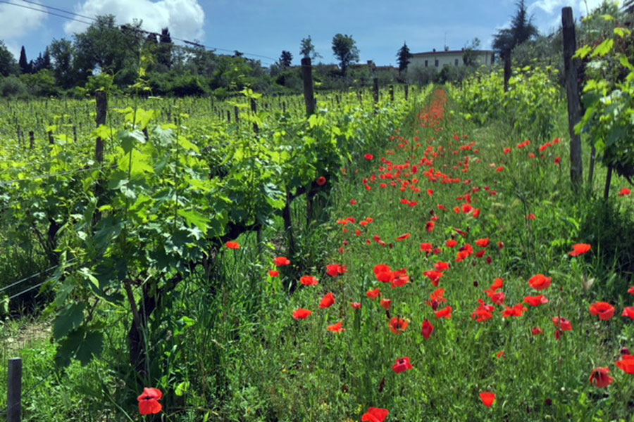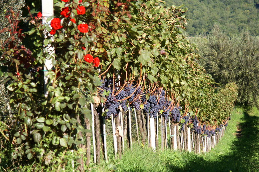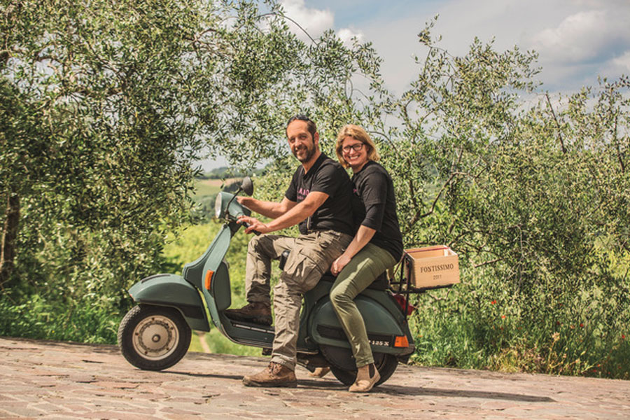 Schon Vater Konrad Schmitt war zum leidenschaftlichen Weinbauer geworden. Dem Deutschen hatte es die Toskana angetan – wem nicht? 1994 wurden 15 Hektar erstanden und davon auf achteinhalb Hektar bestehende Weinberge sorgsam neu bepflanzt, dazu in deutscher Gründlichkeit die Cantina renoviert und für die Produktion von Qualitätswein mit neuester Technologie adaptiert. Nachdem der kleine Ort Panzano (auf ca. 450 Meter Seehöhe) im Gebiet des Chianti-Classico gelegen ist, stand den vier Buchstaben DOCG (Denominazione di Origine Controllata e Garantita) und ab 1996 dem Gallo Nero, einem schwarzen Hahn auf der Flasche, nichts mehr im Wege. Laut Consorzio Vino Chianti Classico ist die Sorte Sangiovese „l´anima del Chinati Classico“, eben dessen Seele, und muss, so will es das nicht unkomplizierte Regelwerk, mindestens 80% ausmachen. Mit der aus dem relativ hohen Säureanteil resultierenden Frische wurde Chianti zum Synonym italienischer Lebensfreude, die einst aus dem Urlaub in der Fiasco, der Korbflasche, in die nördliche Heimat transportiert wurde. Mittlerweile sind es gängige Flaschen, die sich in Kartons wesentlich einfacher verpacken und verschicken lassen und, so Experten, der Qualität zuträglicher sind. Tochter Vicky hat sich in einen Italiener verliebt und diesen geheiratet. Mit Guido führt sie nun die Fattoria Le Fonti, deren Weinberge praktischerweise U-förmig um das Weingut angeordnet sind. Der Boden besteht aus Schiefer, Lehm, Sand und Stein und bietet damit unter der Bezeichnung „Galestro“ die ideale Mischung für 85% Sangiovese Reben und den Rest für Merlot und Cabernet. Vicky Schmitt-Vitali teilt wie viele andere verantwortungsvolle Winzer die Ansicht, dass guter Wein im Weinberg entsteht. Mit einer Hand voll Mitarbeitern kümmern sich sie und Gatte intensiv um die Reben und achten penibel darauf, dass wirklich nur die besten Trauben in den Keller kommen. Es erscheint beinahe selbstverständlich, dass naturnah und umweltschonend in integrativer Weise gearbeitet wird. Der Lohn dafür: Alle Weinberge und Olivenhaine sind biologisch zertifiziert (ICEA). In jeder zweiten Reihe wachsen zwischen den Stockreihen Rucola, Gräser, rote Rüben, Bohnen und Hopfen. Sie lockern den Boden auf und werden im Frühjahr als Dünger zur Stickstoffabgabe eingepflügt. Die überschaubaren Ausmaße der Fattoria lassen eine intensive, ja, persönliche Bearbeitung jeder einzelnen Rebe zu, u. a. mit Stutzen der Geiztriebe, einer „grünen“ Ernte, also der Entfernung überschüssiger Trauben im August, und der Handlese im Herbst.