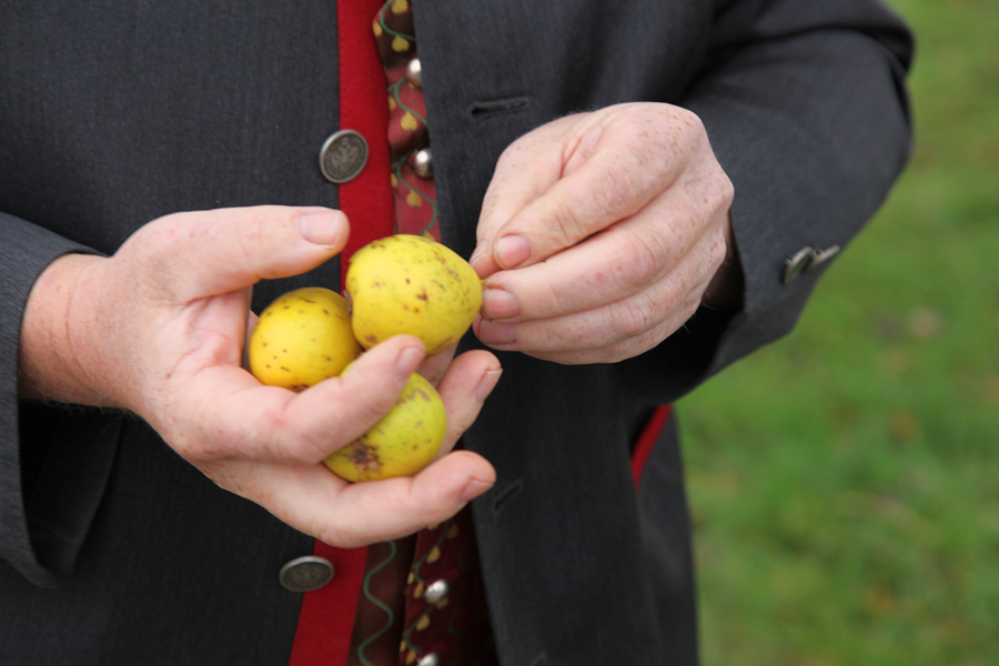 Es gibt den Spruch, dass Birnenpflücken ein Unsinn ist, weil sie, wenn sie reif sind, von selbst herabfallen. Die Bäume wären für eine Ernte per Leiter ohnehin nicht günstig. Es handelt sich meist um würdige alte Riesen, die freistehend an Straßenrändern und in den Wiesen ihre Größe entfalten konnten. Als Streuobstwiesen bezeichnen die Bauern die Standorte ihrer Birnbäume, unter denen im Herbst mit demütigem Buckeln die saftigen Früchte eingesammelt werden.