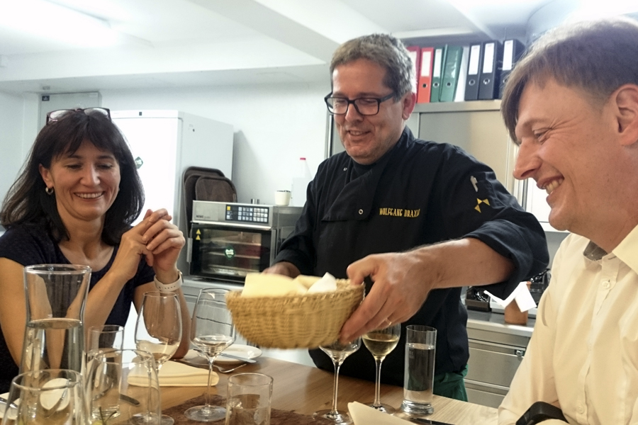 Christiane und Johannes Scheiblauer mit ihrem Küchenchef Wolfgang Draxler am Chef-Table
