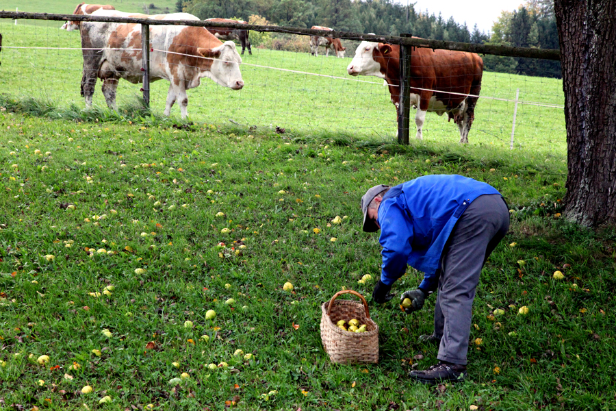 Es ist noch gar nicht so lange her, dass diese Zierden einer einzigartigen Landschaft in größter Gefahr waren. Da half auch ihre prächtige Blüte nichts, die Frühling für Frühling die Gegend in ein weißes Zauberreich verwandelt. Sie wurden umgesägt, um für Mähmaschinen freie Fahrt zu haben. Erst als Leute wie Toni Distelberger den unschätzbaren Wert ihrer Obstbäume erkannten, setzte ein Umdenken ein. Die Bauern in den mächtigen Vierkantern begannen wieder, sich der mühseligen Arbeit des Mostelns zu unterziehen.
