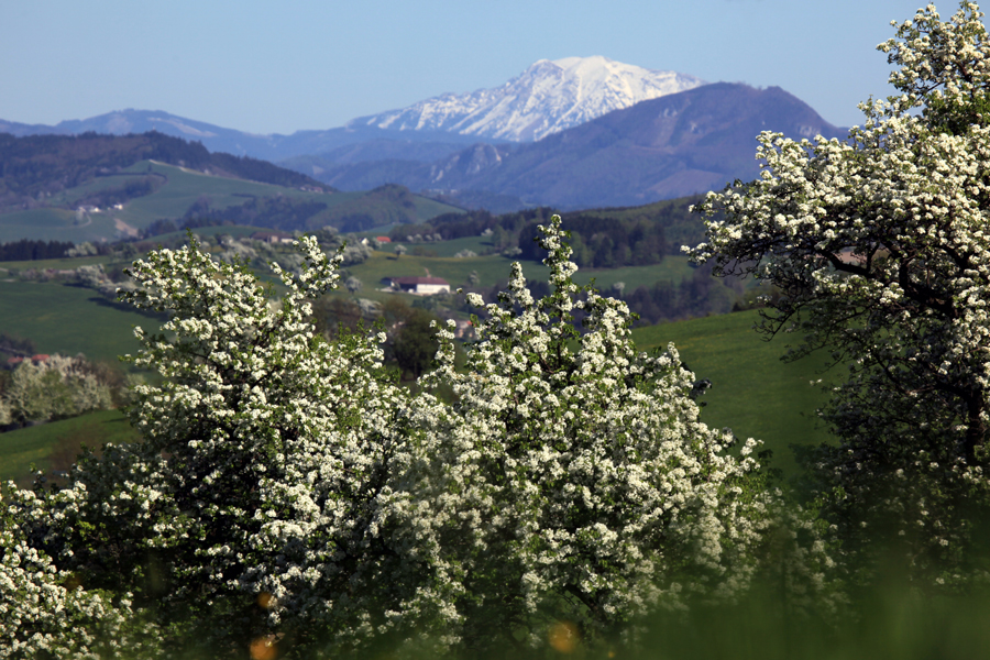 Blick auf den Ötscher zur Zeit der Birnbaumblüte