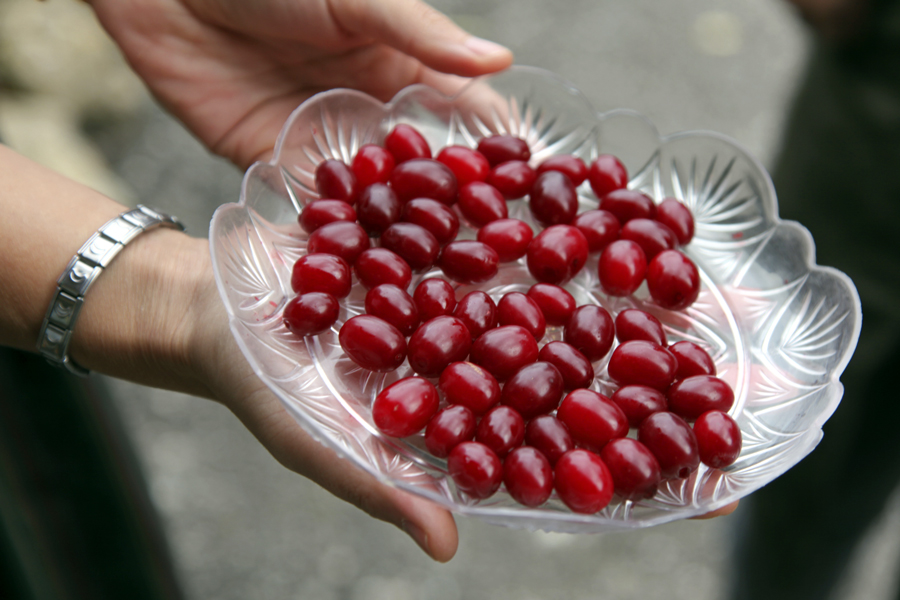Diesbezüglich ist Hans Weiß durchaus streitbar und will nichts von der Kornelkirsche wissen, da die Frucht keine Kirsche ist. Besser gefällt ihm schon Olive des Nordens, allein wegen ihrer länglichen Form, ihrem Kern und der Art wie sie geerntet wird. Eine Kostprobe von den eingelegten Dirndln überzeugt, wenngleich das Fruchtfleisch pikant süßsäuerlich ist. „Dazu muss sie aber bereits abgefallen sein“, setzt Weiß hinzu, „vom Baum selbst gepflückt sind sie unreif und nichts als sauer.
