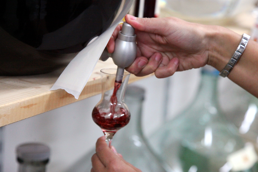 Schon beim Zugehen auf die Mostelleria sind die Fässer mit der Aufschrift „Mostello“ neben der stimmungsvollen Fassade des gefühlvoll restaurierten Mostkellers aus 1894 nicht zu übersehen. Um seinen Charakter voll entfalten zu können, ist diese Reifung über ein ganzes Jahr im Freien unerlässlich.