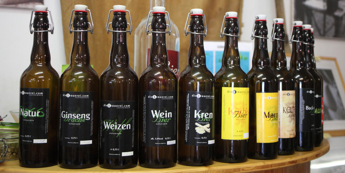 Kultur und Weindas beschauliche MagazinEine vielfältige Auswahl an Spezialbieren BRAUEREI LEUTSCHACH Ein bieriger Exkurs zu den Hopfenbauern Schon bei der Anfahrt zur Marktgemeinde Leutschach fallen lange Stangen auf, an denen sich Hopfen nach oben rankt. Sie verdecken die Weingärten, in denen selbstverständlich auch hier südsteirischer Wein gedeiht. Nach der Ortseinfahrt lockt die Ankommenden eine Tafel zu einer Brauerei und zu einem Museum. In einem stimmungsvollen Gewölbe gibt es Labung in Form eines erstaunlich wohlschmeckenden trüben Biers und bei entsprechender Anmeldung auch eine Führung durch den Betrieb. Empfangen werden die Besucher von Wolfgang Dietrich, der hier in den Räumen eines ehemaligen Kaufhauses Sudpfanne und Gärtanks installiert hat. Er ist an sich gelernter Weinsommelier, hat jedoch seine Liebe zum Gerstensaft, besser gesagt, zu dessen Erzeugung entdeckt. Sein Motto: Bier und Gesundheit. Das heißt, das hier gewonnene Bier wird nicht filtriert oder anderweitig geschönt. Man trinkt Natur pur. Gegen so manche Skepsis hat er sich durchgesetzt, den Braumeister Hans Seidl von der Murauer Brauerei engagiert und mit der Produktion von ungewöhnlichen Sorten in kleinen, aber feinen Mengen begonnen, nicht ohne damit noch mehr Zweifler auf den Plan zu rufen.