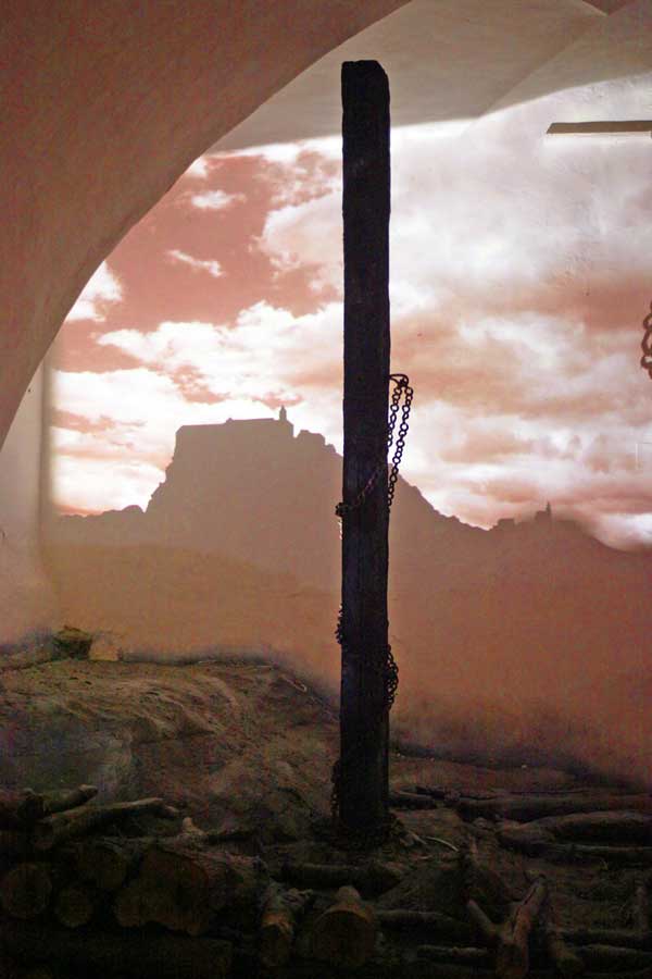Beeindruckend gestaltet ist das Hexenmuseum. Projektionen an der Wand des alten Gemäuers laden zum Lesen ein. Man erfährt, wann die Hexenprozesse waren. Sie fanden nicht, wie man allgemein annimmt, im finsteren Mittelalter statt, sondern in der anbrechenden Neuzeit. Es gab auch eine Rechtsgrundlage. Kaiser Karl V. hatte für sein ganzes Reich die „Constitutio Criminalis“ erlassen. Details geregelt wurden im Hexenhammer, verfasst vom Dominikaner Heinrich Kramer (Henricus Institoris). Der Wahnsinn hielt bis zu Kaiser Joseph II. an, der 1887 die Hexenprozesse abschaffte. Bis dahin hatte man nicht den geringsten Zweifel, dass vernichtete Ernten, ausbleibender Kindersegen oder sonstige Ungemach durch Hexen und ihren Pakt mit dem Teufel herbeigeführt waren. Ausführlich wird der Feldbacher Hexenprozess beschrieben. Darin wurden mehrere Priester, die Frau des Burgpflegers Katharina Baldauf, man nannte sie die „Blumenhexe“, und ungefähr 90 weitere Personen anno 1675 zum Tod auf dem Scheiterhaufen verurteilt. Das Schicksal von Frau Baldauf wird im Besonderen vorgestellt.
