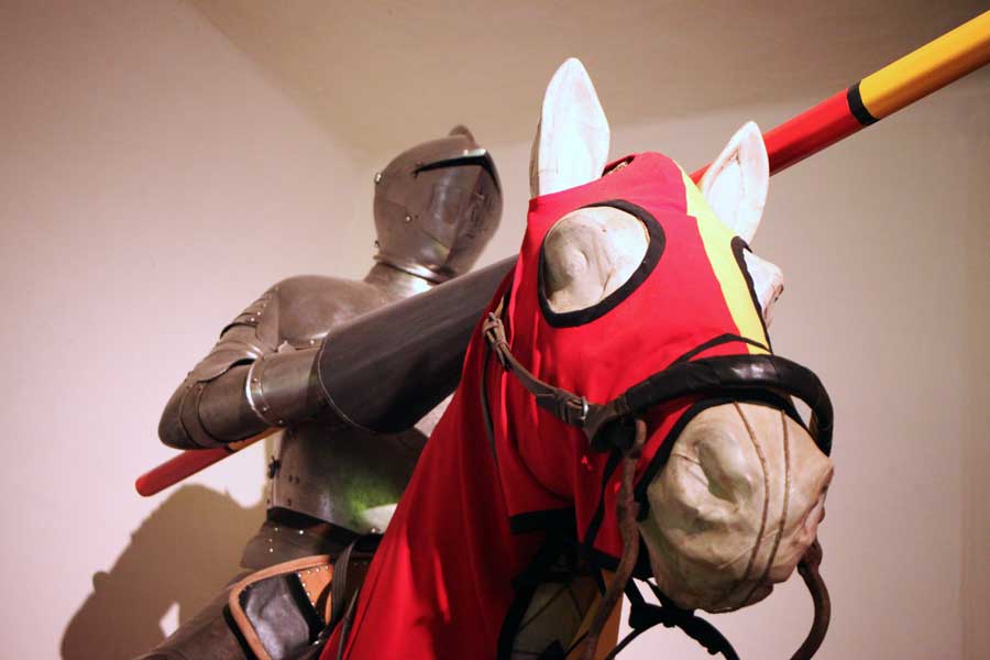 Das Waffenmuseum steht unter dem Motto „Hieb und Stich“. Empfangen wird der Besucher von einem Ritter zu Pferd und im Harnisch. Brustpanzer, Kettenhemd und Helm sollten ihn vor feindlichen Angriffen schützen. Ihm gegenüber standen Landsknechte, die mit Fernwaffen wie Bögen und Armbrüsten ausgestattet waren und dem schweren Bihänder leicht ausweichen konnten. Hands on! heißt es hier. Man darf ein Gewehr des 16. Jh. anheben und versuchen, damit ins Ziel zu treffen.