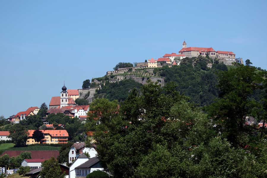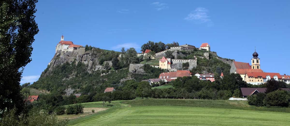 Man sieht sie schon von weitem. Über einen mächtigen Basaltfelsen breitet sich wehrhaftes Gemäuer aus, das noch heute die Südoststeiermark zu beherrschen scheint. Die Tage, als da oben Ritter wie Luitbold aus dem Geschlechte der Riegersburg-Wildonier oder die Kuenringer hausten und gegebenenfalls das Land verteidigten, sind lange vorbei. Aber noch Feldmarschall Edmund Graf von Montecuccoli schwärmt in seinen Erinnerungen an den Sieg über das osmanische Heer 1664 bei Mogersdorf bzw. Szentgotthart, wenn er die Burg als „die stärkste Festung der Christenheit“ bezeichnet. Heutzutage „erobert“ man die Festung per Lift, ganz bequem in einer Kabine, die Besucher hinauf und herunter transportiert. Es ist noch nicht lange her, dass man den schweißtreibenden Aufstieg zu Fuß erledigte und sich dabei vorstellte, wie mühsam es einst war, Lebensmittel und Wasser dorthin zu schaffen. Ein besonderer Weg ist der Eselsteig, gerade so breit, dass ein bepacktes Maultier drauf gehen kann. Man muss dazu wissen, dass es sich eigentlich um zwei Burgen handelt.