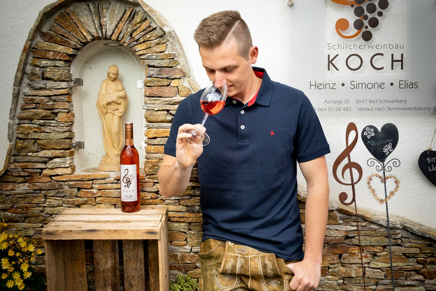 2022 hat Elias Koch mit der Ausbildung zum Meister in Weinbau und Kellerwirtschaft im Landesweingut Silberberg begonnen. In diesem Jahr hat er auch erstmals „seinen“ Schilcher Klassik DAC gekeltert. Elias erinnert sich, dass ihn pure Neugierde getrieben hat, beim Jungwinzerwettbewerb und damit automatisch bei der Steirischen Landeswertung teilzunehmen. Die Sensation: Auf Anhieb wurden sein Schilcher Finalist bei der Landesbewertung und er selbst Sieger bei den Jungwinzern. Diese Ehre ist für ihn der Ansporn, wie Elias so schön sagt, sich ständig weiter zu entwickeln, niemals stehen zu bleiben und jedes Jahr aufs Neue ein Kunstwerk in die Flasche zu bringen. Gemeint ist damit der „fruchtigste“ Rosé, eben der Schilcher, dem er die ihm zukommende Wertschätzung erweisen will; mit zart rötlichen Reflexen, dem Duft nach Walderdbeeren, einem vielschichtig ansprechenden Aroma und vor allem mit moderater Säure.