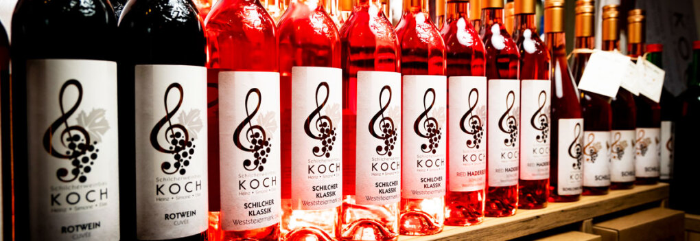 Kultur und Weindas beschauliche MagazinFlaschenparade im Regal beim © Schilcherweinbau Koch ELIAS KOCH Sein Schilcher, der alle Stück´ln spielt