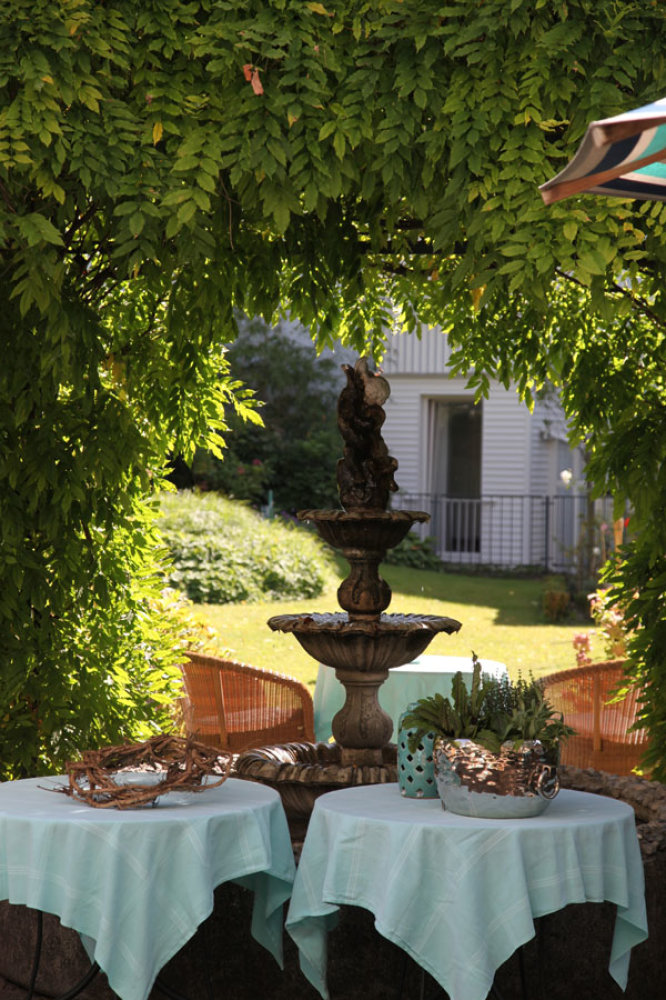 Bevor es Zeit ist, sich auf das Zimmer zurück zu ziehen, sollte man noch einen Blick auf die Wände des Hotels werfen. Eine ganze Reihe von Bildern stammt von Irene Andessner, die mit Fotos von aufwändig gestalteten Tableaus vivant ihre Kunst verwirklicht. Sie wurde zu einer persönlichen Freundin der Besitzer, geradeso wie das Künstlerehepaar Anne und Peter Knoll aus der Steiermark. Von diesen beiden stammt die Dekoration, von der Ente im paradiesisch ruhigen Garten des Hotels bis zu Fliesen in den durchwegs verschieden gestalteten Bädern, die Idee zu einer mit Silhouetten von Autos verzierten Garage und die schmucken kleinen Fahnen auf den Gängen. An den Architekten der 1914 erbauten Seevilla erinnert das Steinportal. Franz Baumgartner, der das Bild der Wörtherseearchitektur wie kein zweiter geprägt hat, hat auch dieses Gebäude entworfen, das bis heute seinen Charme aus dem Jugendstil dank der liebevollen Pflege der Familie Kenney bewahrt hat.