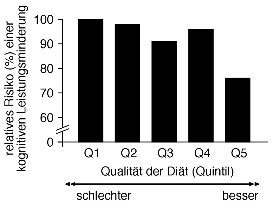 Eine sehr große in 40 Ländern mit 27860 Männern und Frauen über 55 Jahren mit erhöhtem Risiko für kardiovaskuläre Ereignisse durchgeführte Studie (38) ging ebenfalls der Frage nach dem Zusammenhang von Diät und kognitiver Leistungsfähigkeit (gemessen mit dem Mini Mental State Examination, MMSE) nach. Während des 56-monatigen Follow-Up trat bei 4699 Probanden eine messbare Verminderung der kognitiven Leistungsfähigkeit („cognitive decline“) auf.