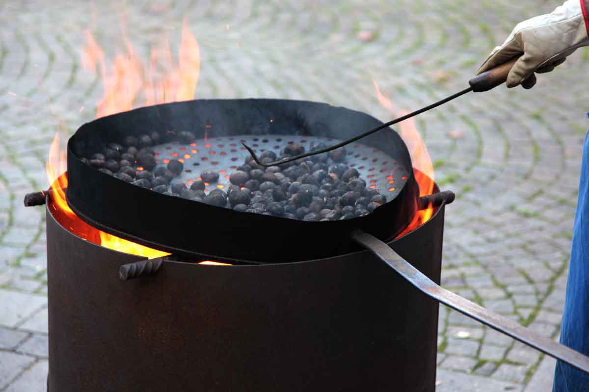 Unabdingbar sind für´s Törggelen gebratene Kastanien, auf gut tirolerisch Keschtn. Wenn weder eine offene Feuerstelle, noch eine große Pfanne mit Löchern vorhanden sind, tut´s auch das Backrohr. Um die Kastanien herum werden Rollgerstlsuppe mit viel Geselchtem, Tiroler Speck, würziger Käse und Schüttelbrot gruppiert. Beschlossen wird das herbstliche Mahl mit den süßen Kastanienkrapfen.