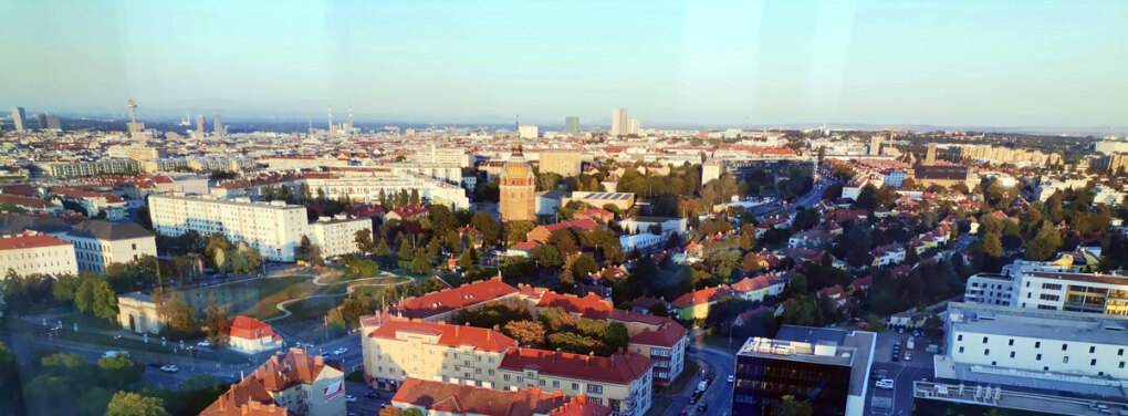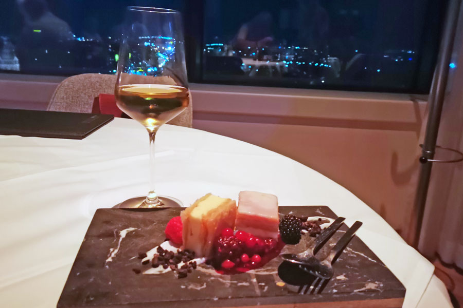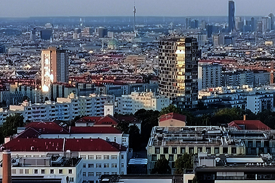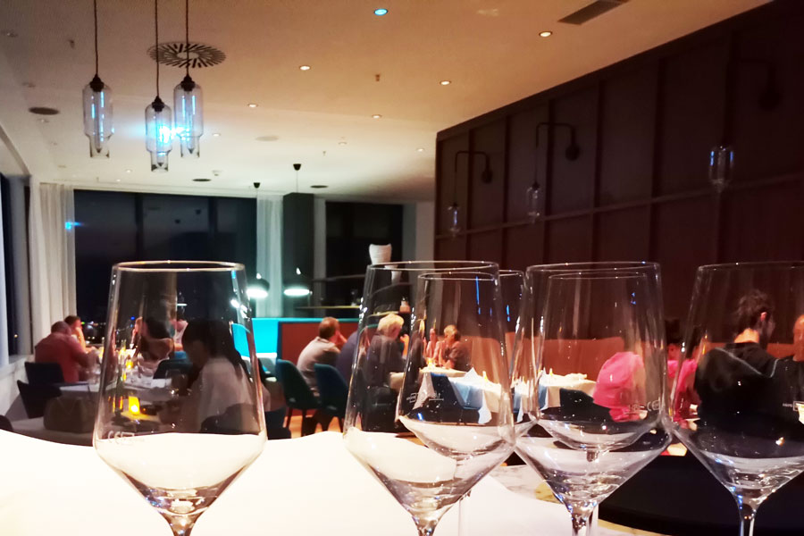 Kultur und Weindas beschauliche MagazinAussicht auf Wien über den Favoritner Wasserturm TWENTYTWO RESTAURANT Lustvoll dinieren mit grandioser Aussicht Es kommt ganz auf die Tageszeit an, was man von dort oben sieht. So lange noch die Sonne über der Stadt scheint, wandert der Blick auf drei Seiten über ein Meer von Dächern und im Süden weit hinaus in das Wiener Becken und über die Hügel der Thermenregion. Mit ihren letzten Strahlen beginnen Glasfassaden von Hochhäusern unwirklich zu glänzen und die historistische Architektur des Favoritner Wasserturms warmes Ziegelrot zu zeigen. Bald darauf denkt man unwillkürlich an den Song von Rainhard Fendrich: Haben Sie Wien schon bei Nacht gesehen? In der Ferne tauchen grell beleuchtete Fahrgeschäfte des Praters auf, in der Bildmitte der Stephansdom und auf der nahen Triester Straße endlose gemächlich dahin ziehende Scheinwerfer. Gelegenheit zum Panaromablick hat man schon beim Frühstück ab 6.30 Uhr oder beispielsweise jeden Sonntagmittag beim Brunch, der einmal im Monat die Schmausenden mit Livemusik unterhält.