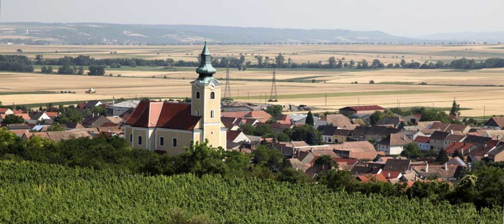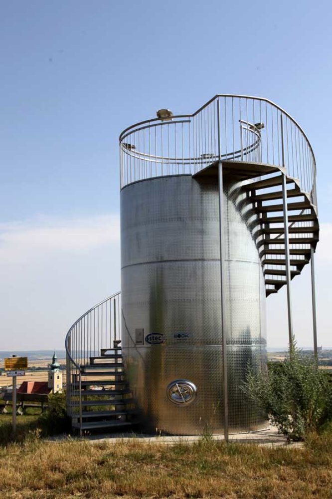 Röschitz hat übrigens drei Kellergassen. Entlang eines Erlebnisweges wird man von der ersten, dem Ziegelstadl, nach einem Besuch der Pfarrkirche St. Nikolaus durch die Rieden geführt. Man wandert (ohne große Steigungen) bis hinauf zur Weinviertelwarte, die zwar ungewöhnlich, aber durchaus passend nicht aus Holz, sondern aus einem riesigen Stahltank errichtet wurde. Die Seehöhe ist zwar gering, der Blick von dieser Anhöhe aber umso weiter und an klaren Tagen könnte sogar der Schneeberg im Süden zu sehen sein. Zurückgekehrt zum Ausgangspunkt sollte man nicht versäumen, den „Weberkeller“ zu besuchen, das wohl kurioseste Kunstwerk aus Löss, an dem etliche Generationen einer Familie ihr Leben lang gearbeitet haben. Vielleicht gibt´s an diesem Tag in Röschitz auch was zum Feiern. Wenn ja, dann spielt die Blasmusik auf und mit dabei, auf dem Bassflügelhorn, ist unser junger Winzer Christoph Berger.