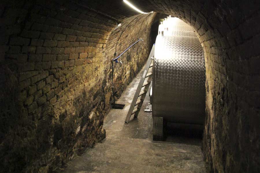 Die reifen Trauben kommen schließlich in den Keller zur Presse. In diesem Fall handelt es sich tatsächlich um einen richtig schönen alten Keller in der Marktweg-Kellergasse. In einem kleinen Kellerhaus verbirgt sich eine moderne Anlage zur Traubenverarbeitung und in den zu einem beachtlichen Labyrinth verbundenen Schläuchen dürfen tief unter der Erde in stets gleichbleibender Temperatur die herrlichsten Weine heranreifen. In Röschitz ist Christoph Berger der einzige von den ca. 17 Qualitätsbetrieben des Ortes, der sich noch diese Mühen antut.