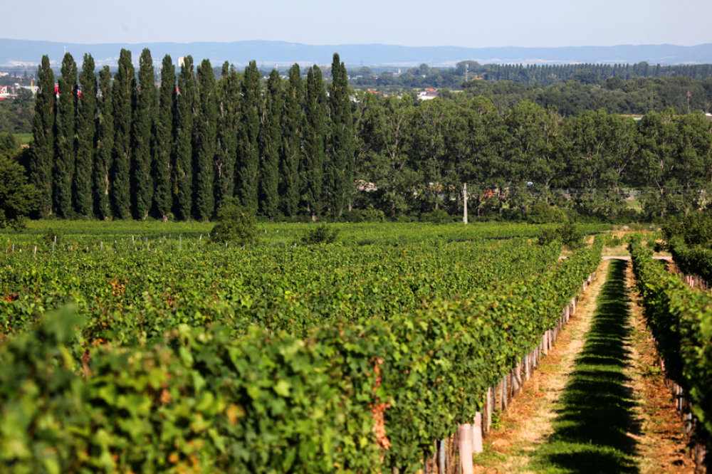 Es sind sanfte Hänge, es gibt keinen spektakulären Gipfel und schon gar keine Aussichtswarte. Trotzdem lohnt sich ein Spaziergang auf den Harterberg südöstlich von Baden. Auf einem leicht ansteigenden Weg schlendert man durch Weingärten nach oben und staunt über das Panorama, das sich mit jedem Schritt weiter öffnet. Im Rücken liegt die Kurstadt Baden und hinter ihr an den Hängen des Wienerwaldes ist deutlich die Kirche von Gumpoldskirchen zu erkennen. Im Osten zeigen Pappelreihen den Verlauf des historischen Wiener Neustädter Kanals, hinter denen sich im Blau des Dunstes jenseits des Wiener Beckens das Leithagebirge dahinzieht. Der Blick in den Süden erfordert einen klaren Tag, um die Hohe Wand und sogar noch die Bucklige Welt erkennen zu können. Selbst der Winzer Gerhard Schagl ist von der Aussicht von seinem Arbeitsplatz aus begeistert. Und mehr noch von der Lage für seine Weinstöcke. Der Harterberg, auf dem der größte Teil seiner Rebflächen gedeiht, ist eine Toplage der Thermenregion.